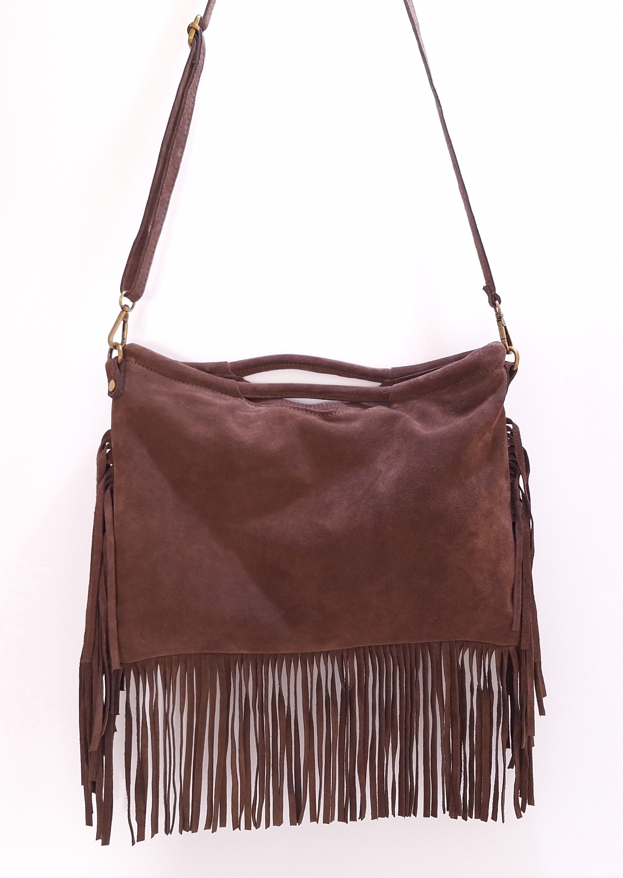 - Modna, mała listonoszka ozdobiona frędzlami, zawieszona na pasku, wykonana z eko zamszu w ciemnobrązowym kolorze.