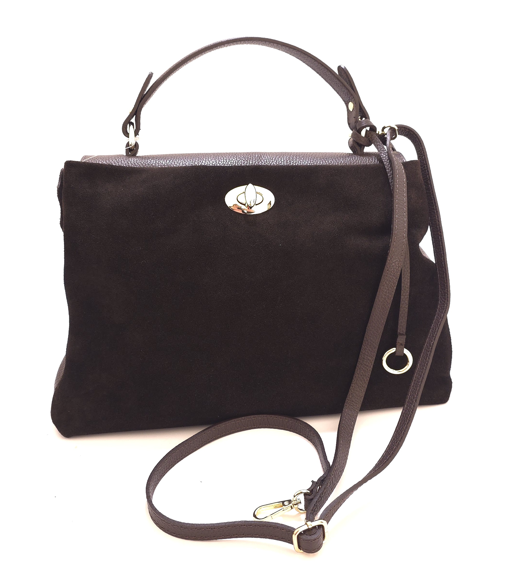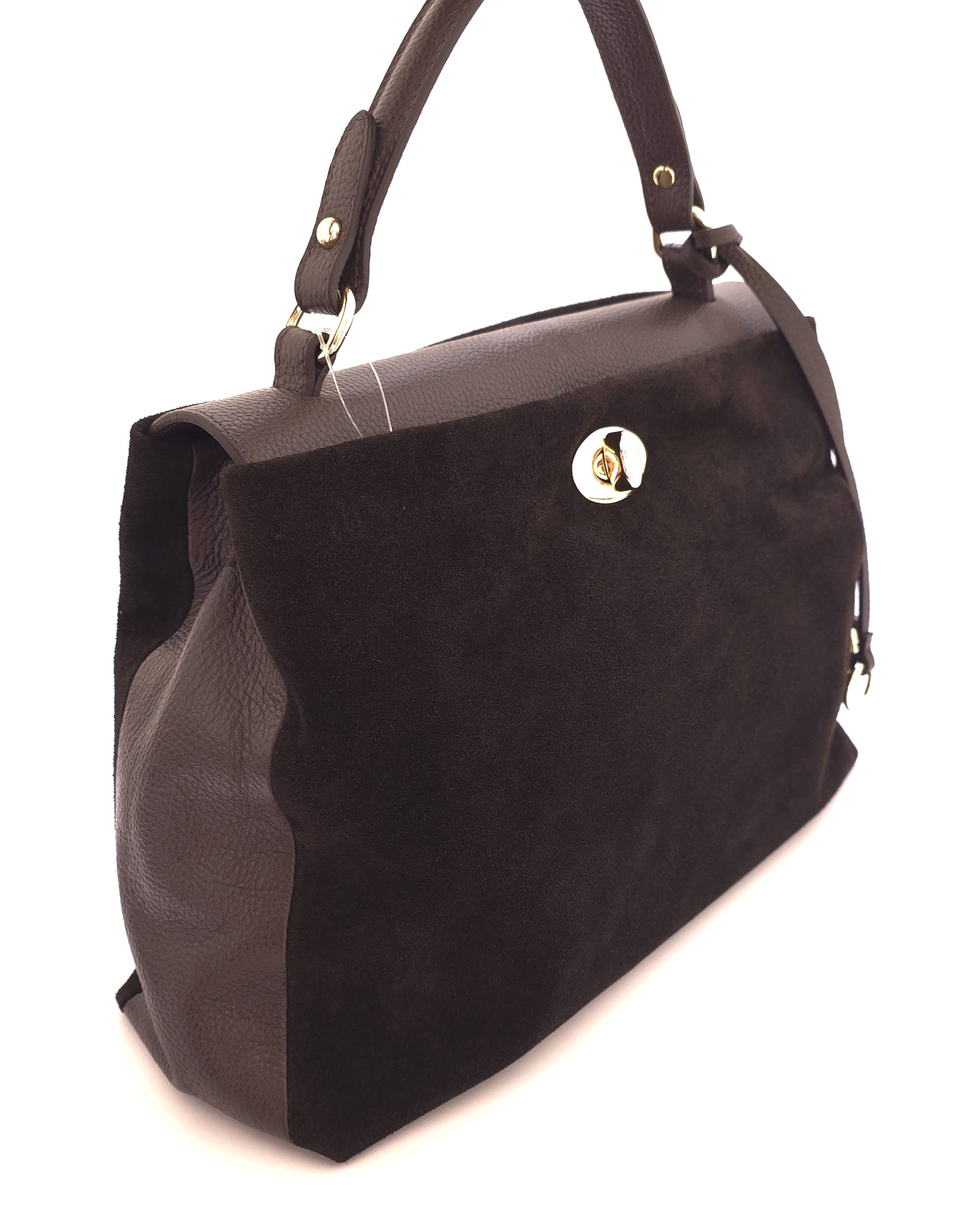 - Torebka uszyta z połączenia naturalnej skóry licowej i zamszowej w brązowym kolorze,