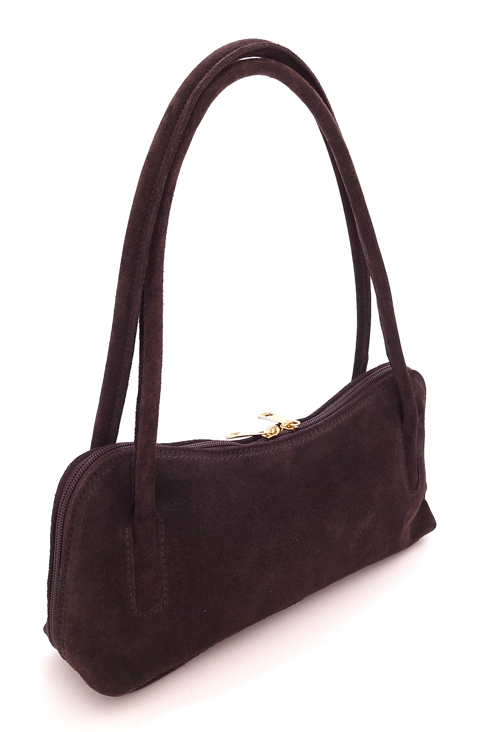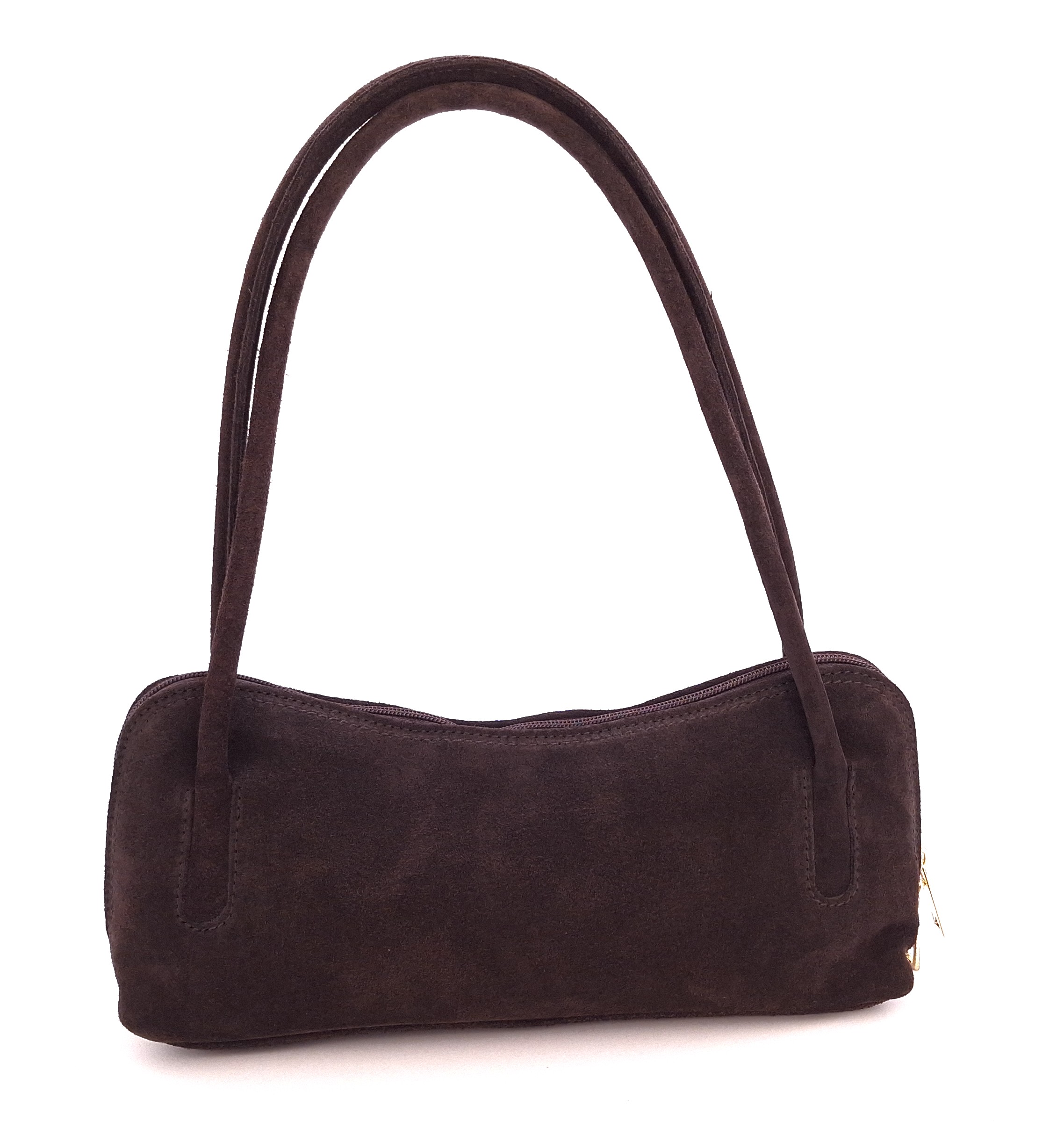 - Stylowa torebka damska jamnik wykonana z naturalnego zamszu w brązowym kolorze. Klasyczna forma o podłużnym kształcie.