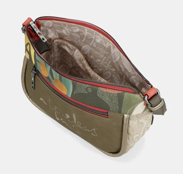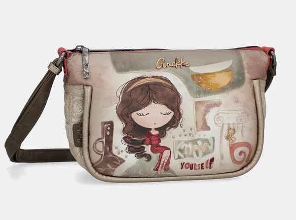 Małej wielkości damska torebka z kolekcji Anekke Muse SS26 wykonana z ekologicznej skóry. Front torebki zdobi grafika przedstawiająca Anekke pośród antycznych, greckich kolumn. Torebka posiada jedną główną komorę zamykaną na zamek błyskawiczny. Wewnątrz znajduje się kieszeń na suwak i i jedna otwarta. Wnętrze wykończone kolorową podszewką. Z tyłu torebki znajduje się dodatkowa kieszeń zamykana na suwak. Listonoszka wyposażona w regulowany pasek, dzięki czemu możesz ją nosić na ramieniu lub crossbody.