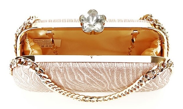 Wzbogać swój wieczorowy look z tą stylową torebką na łańcuszku w kolorze beżowego złota. Wykonana z syntetycznego materiału o delikatnej, przyjemnej w dotyku fakturze. Sztywna konstrukcja nadaje eleganckiego charakteru, a praktyczny zatrzask w formie kwiatka wysadzany mieniącym się diamentem zapewnia bezpieczeństwo Twoim skarbom wewnątrz. Krótki uchwyt umożliwia wygodne noszenie w dłoni, a dołączony odpinany łańcuszek daje opcję noszenia jej na ramieniu, co zwiększa jej funkcjonalność i pozwala na dopasowanie do różnych stylizacji. Damska kopertówka to idealny wybór na wieczorne wyjścia, romantyczne kolacje, bankiety czy wesela. Jej subtelny blask i wyszukany design sprawią, że będziesz się wyróżniać na każdej uroczystości. Postaw na torebkę, która podkreśli Twój wyrafinowany styl i doda Twoim stylizacjom odrobiny luksusu.