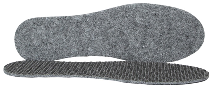 Wkładka wykonana z imregnowanego filcu, skutecznie izolującego stopę przed zimnem. Wyścieła dokładnie dno buta i zapobiega powstawaniu odparzeń. Specjalne wypustki gumowe wypełnione powietrzem na spodzie wkładki dodatkowo zabezpieczają ją przed przemieszczaniem i izolują od wilgotnej wyściółki. Miękkość filcu zapewnia komfort chodzenia.