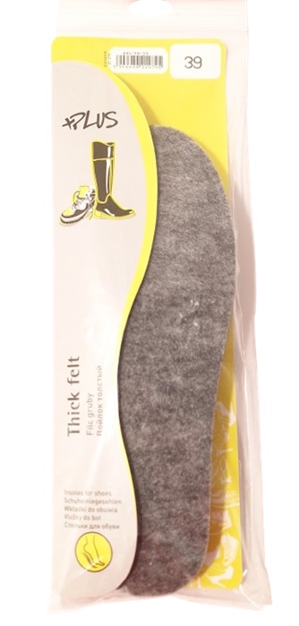Wkładki wykonane z grubego filcu, doskonale izolująca stopę przed zimnem. Zapewniają właściwą temperaturę stopom, a dokładnie wyścielając dno butów zapobiegają powstawaniu odparzeń i niszczeniu wyściółki. Miękkość filcu poprawia również komfort w użytkowaniu obuwia. Zalecane do obuwia jesiennego i zimowego, roboczego oraz domowych bamboszy. Należy je wymieniać regularnie.