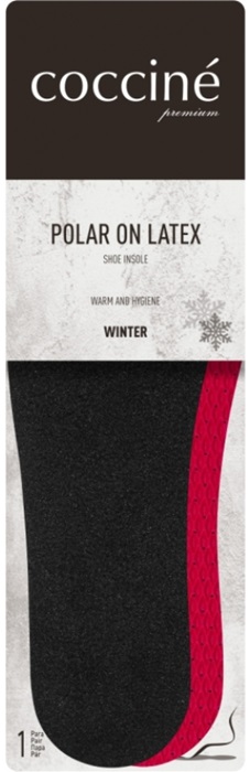 Cocciné Polar on Latex to komfortowa, termoizolacyjna wkładka na warstwie perforowanego lateksu o fakturze rombów od spodu. Z wierzchu pokryta warstwą polaru, zapewniającego ciepło. Posiada właściwości higieniczne i jest niezwykle przyjemna w dotyku. Polar, dzięki swoim wyjątkowym właściwościom, zapewnia skuteczną izolację zarówno od chłodu, stwarzając wrażenie „grzania” stopy, jak i od wilgoci. Wkładka polecana do wszystkich rodzajów obuwia jesienią i zimą, niezwykle komfortowa, bardzo ciepła, trwała i estetyczna.