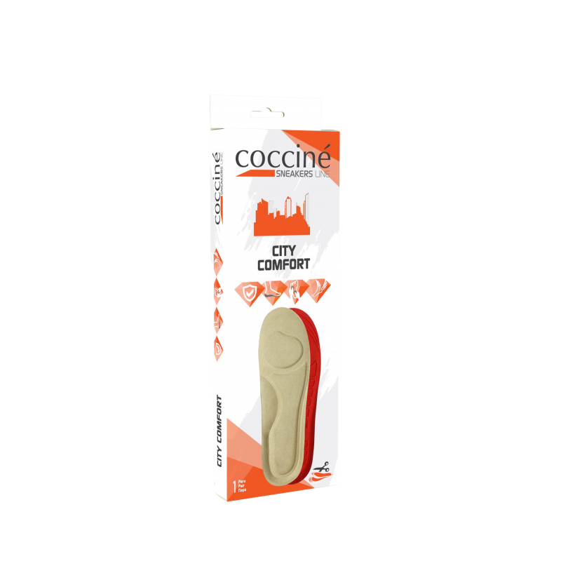Wkładka dla fanów luźnego miejskiego stylu. Zaprojektowana z myślą o najwyższym komforcie i higienie stóp w obuwiu typu sneakers. Profilowana do anatomicznego kształtu stopy. Zapobiega stanom zmęczeniowym mięśni stóp i nóg. Wysokiej jakości materiały oraz zaawansowana konstrukcja, to wszystko składa się na wygodną, czterowarstwową wkładkę Cocciné City Comfort. Dzięki wkładce utrzymasz stopy w higienicznym wnętrzu oraz zahamujesz rozwój drobnoustrojów chorobotwórczych.