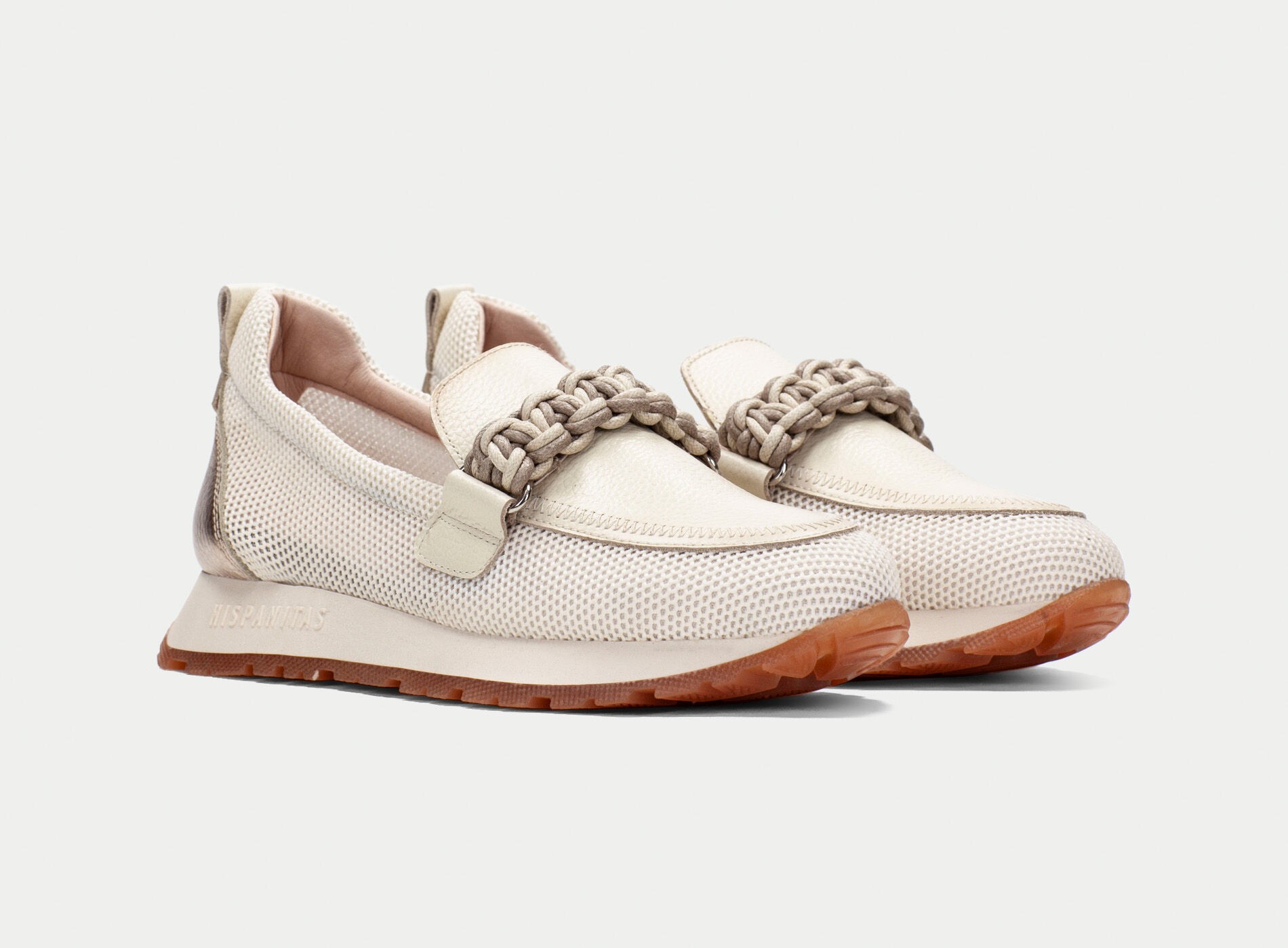 Beżowe półbuty damskie marki Hispanitas to idealny wybór dla kobiet ceniących jakość i ponadczasowy design. Ich uniwersalna kolorystyka sprawia, że doskonale komponują się z wieloma stylizacjami – zarówno codziennymi, jak i bardziej formalnymi. Cholewka wykonana z połączenia przewiewnej siateczki z naturalną licową skórą. Obuwie zdobi pleciona ozdoba na przodzie dodając subtelnego uroku. Model osadzony jest na lekkiej, amortyzującej podeszwie, która zwiększa wygodę i nadaje butom lekko sportowego charakteru.