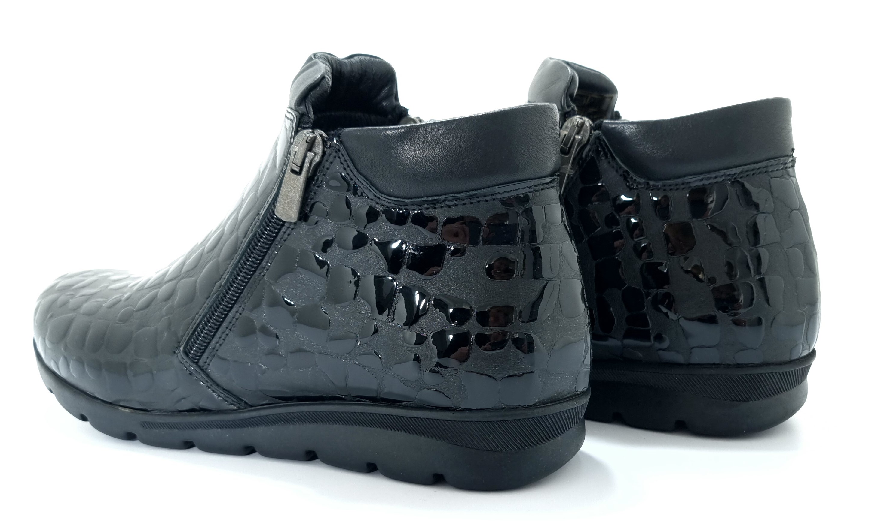 Botki Sokolski są nie tylko eleganckie, ale także praktyczne. Posiadają zapięcie na zamek po obu stronach cholewki, co znacząco ułatwia zakładanie oraz zdejmowanie. Wewnątrz zastosowano materiał ocieplający , dla wyższego komfortu nawet w mroźne zimowe dni. Spody wykonane zostały całościowo z gumy, co zapobiega ślizganiu się. Cholewka wykonana ze skóry naturalnej ozdobiona lakierowanym wzorem imitującym skórę gadzią. Dodatkową zaletą butów jesiennych Sokolski jest wkładka profilująca kształt stopy, wymiękczona pod piętą, aby znacząco podwyższyć komfort chodzenia. Botki damskie Sokolski przeznaczone są na tęższą stopę, odpowiadają tęgości G. Są to wyjątkowo komfortowe botki skórzane na grubej platformie.