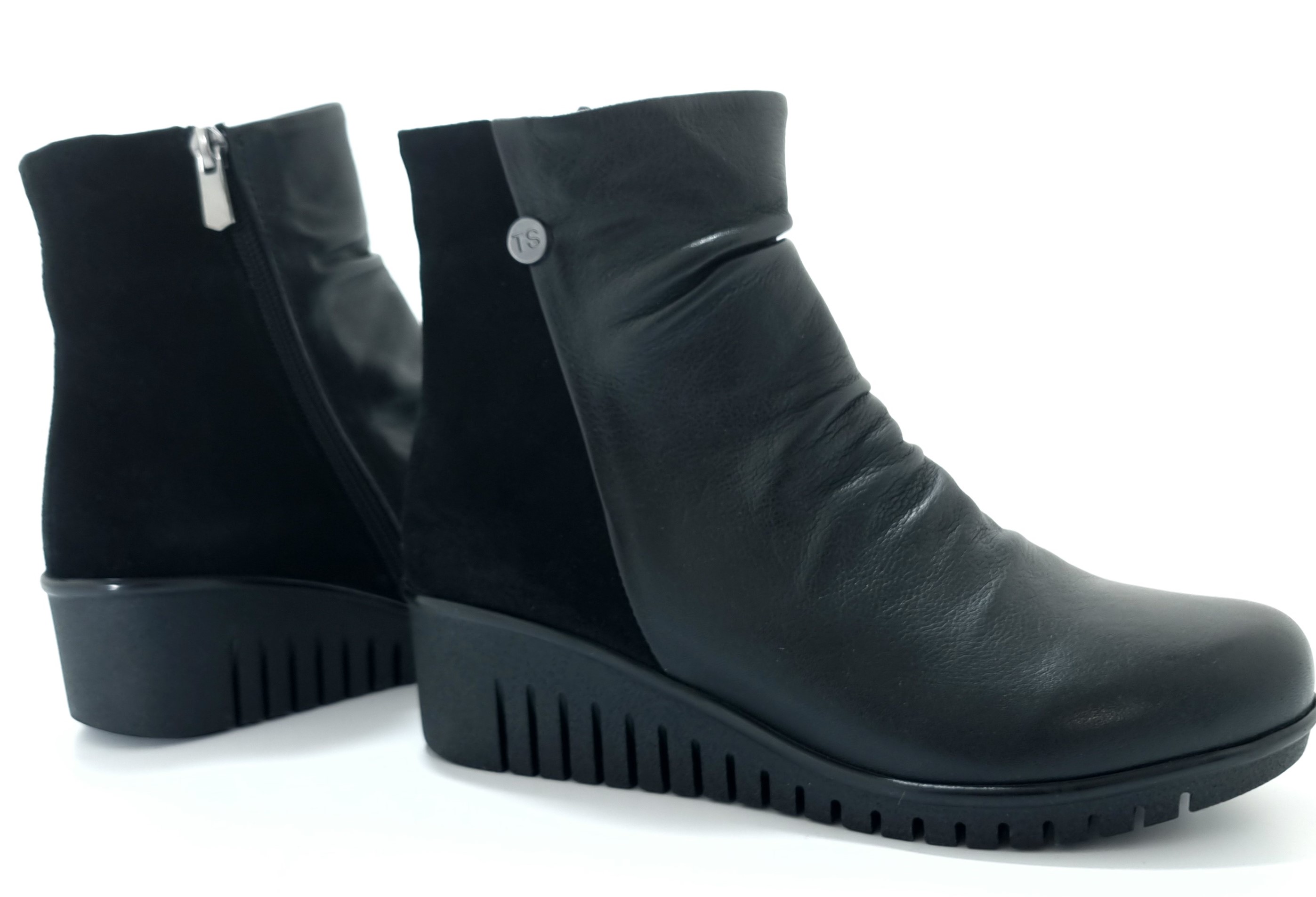 • Wygodne botki skórzane damskie na profilowanej platformie 4 cm, to doskonałe uzupełnienie każdej stylizacji. Marszczona cholewka wykonana z łączonych skór, przód skóra licowa oraz tył z nubuku. Wewnątrz ocieplone materiałem, ze skórzaną miękką wkładką.