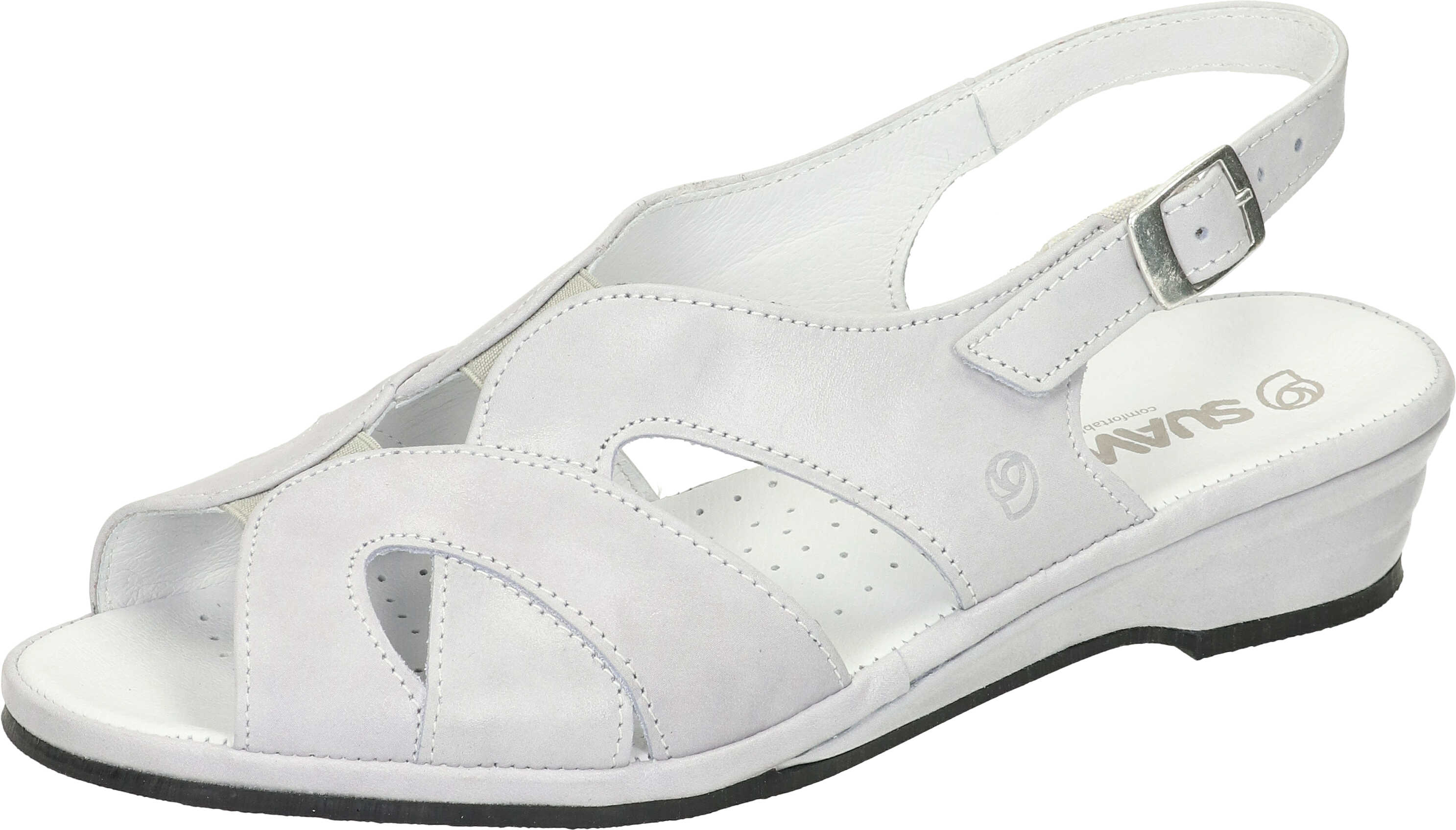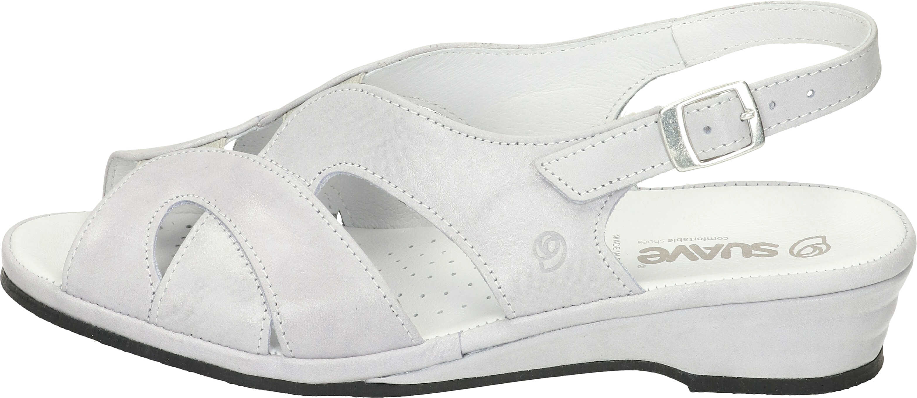 Bardzo wygodne skórzane sandały na niewielkiej koturnie portugalskiej marki SUAVE w jasnoszarym kolorze. Cholewka wykonana z miękkiej naturalnej skóry licowej. Wkładka wykonana także ze skóry naturalnej częściowo perforowana, dzięki czemu ułatwia cyrkulację powietrza. Obuwie zapinane na sprzączkę. W podbiciu zostały wszyte gumki, co pozwala na łatwe dopasowanie się do kształtu stopy. Podeszwa lekka, antyposlizgowa, elastyczna.