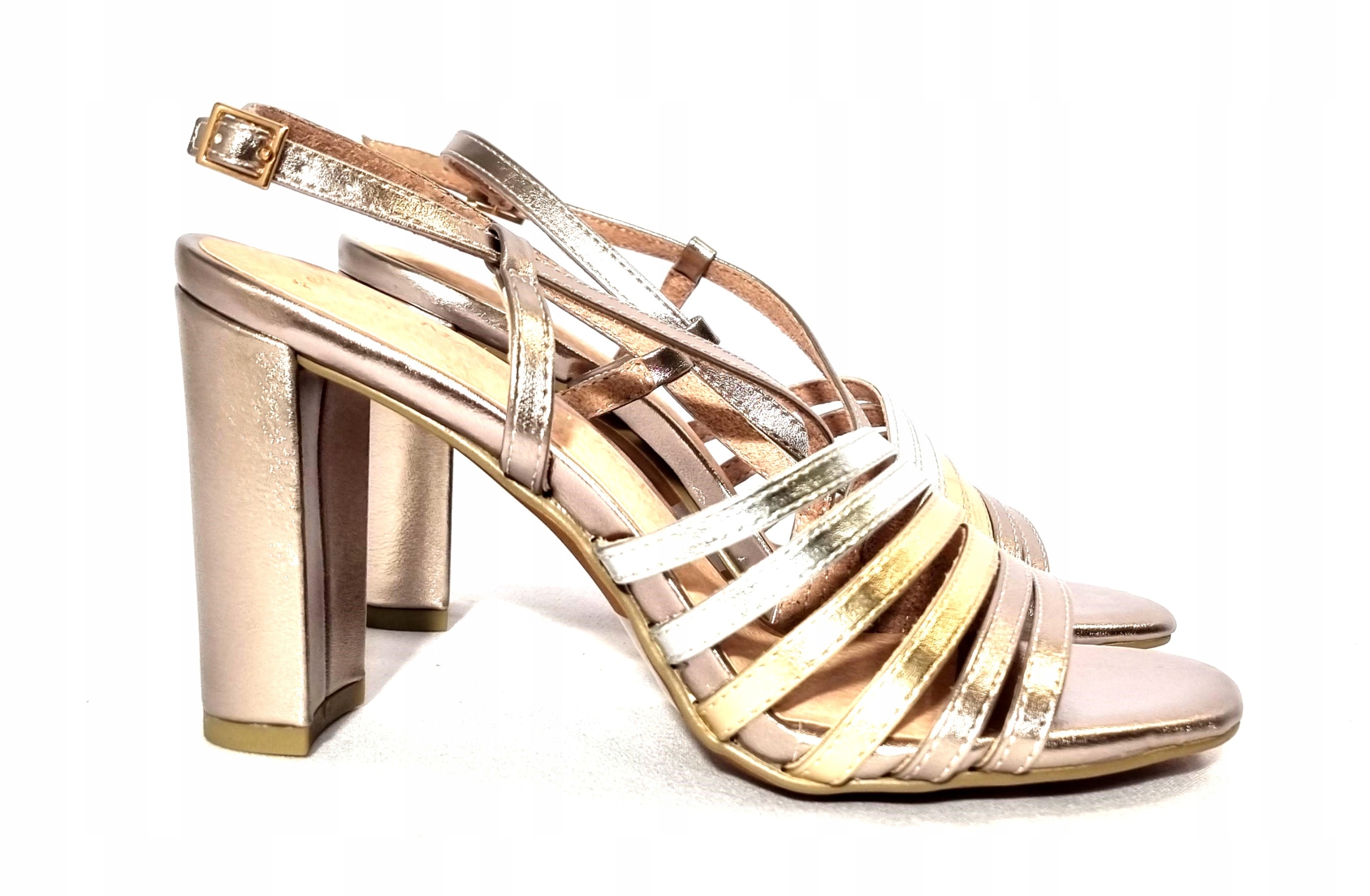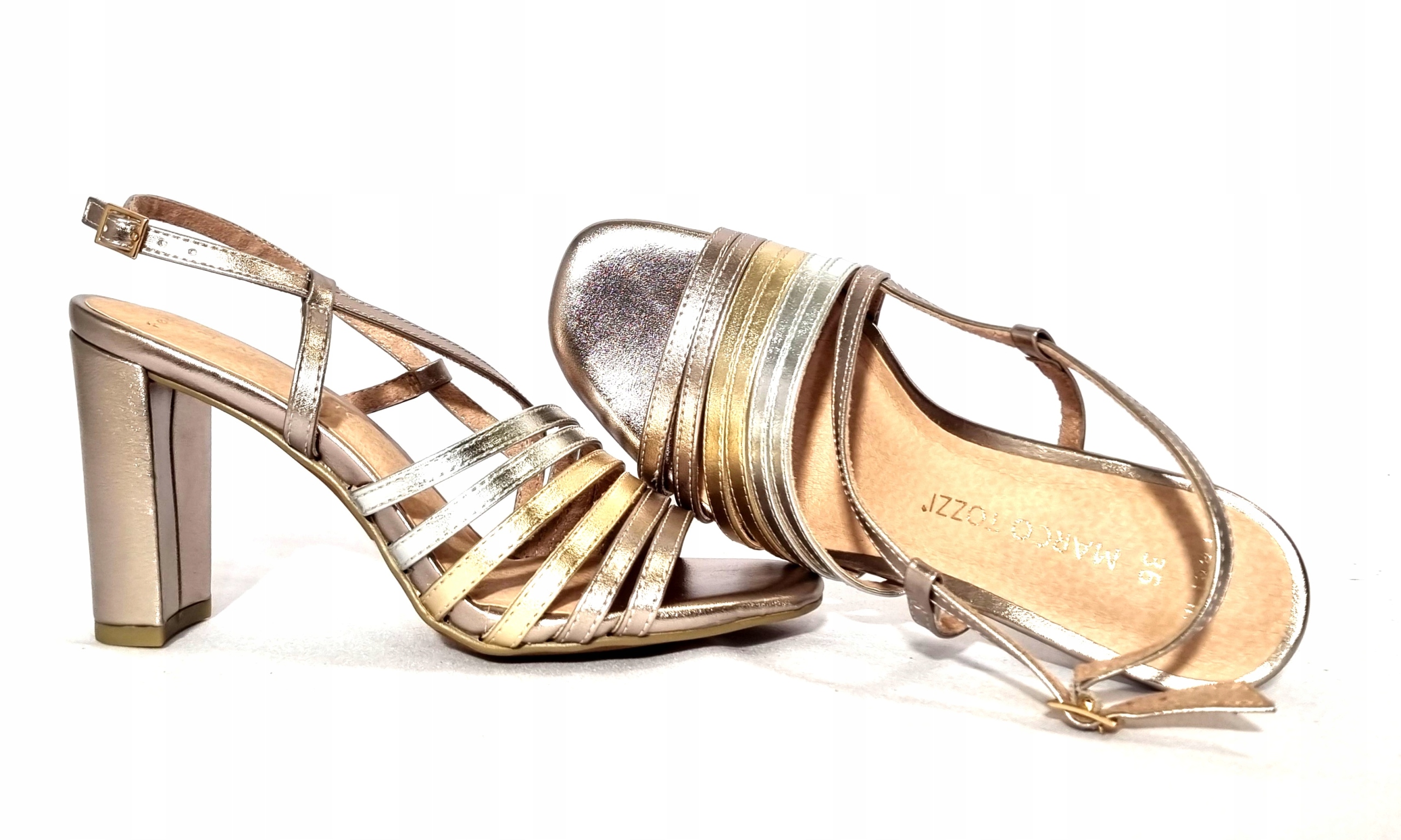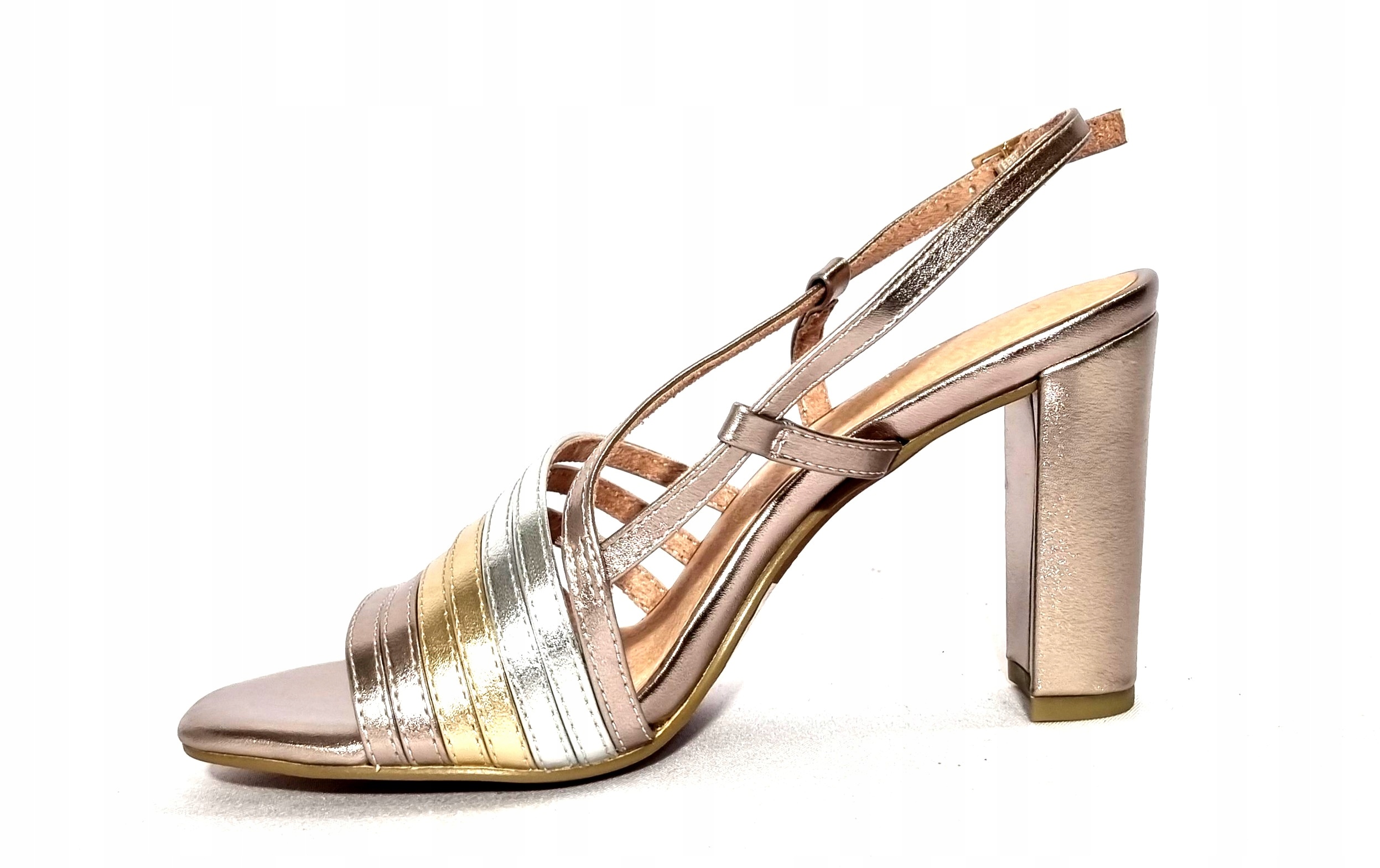 Przedstawiamy panstwu sandały damskie na wysokim obcasie marki Marco Tozzi. Wykonane zostały z błyszczącej skóry ekologicznej. Słupek o wysokości 9,6 cm. Zapięcie na sprzączkę.