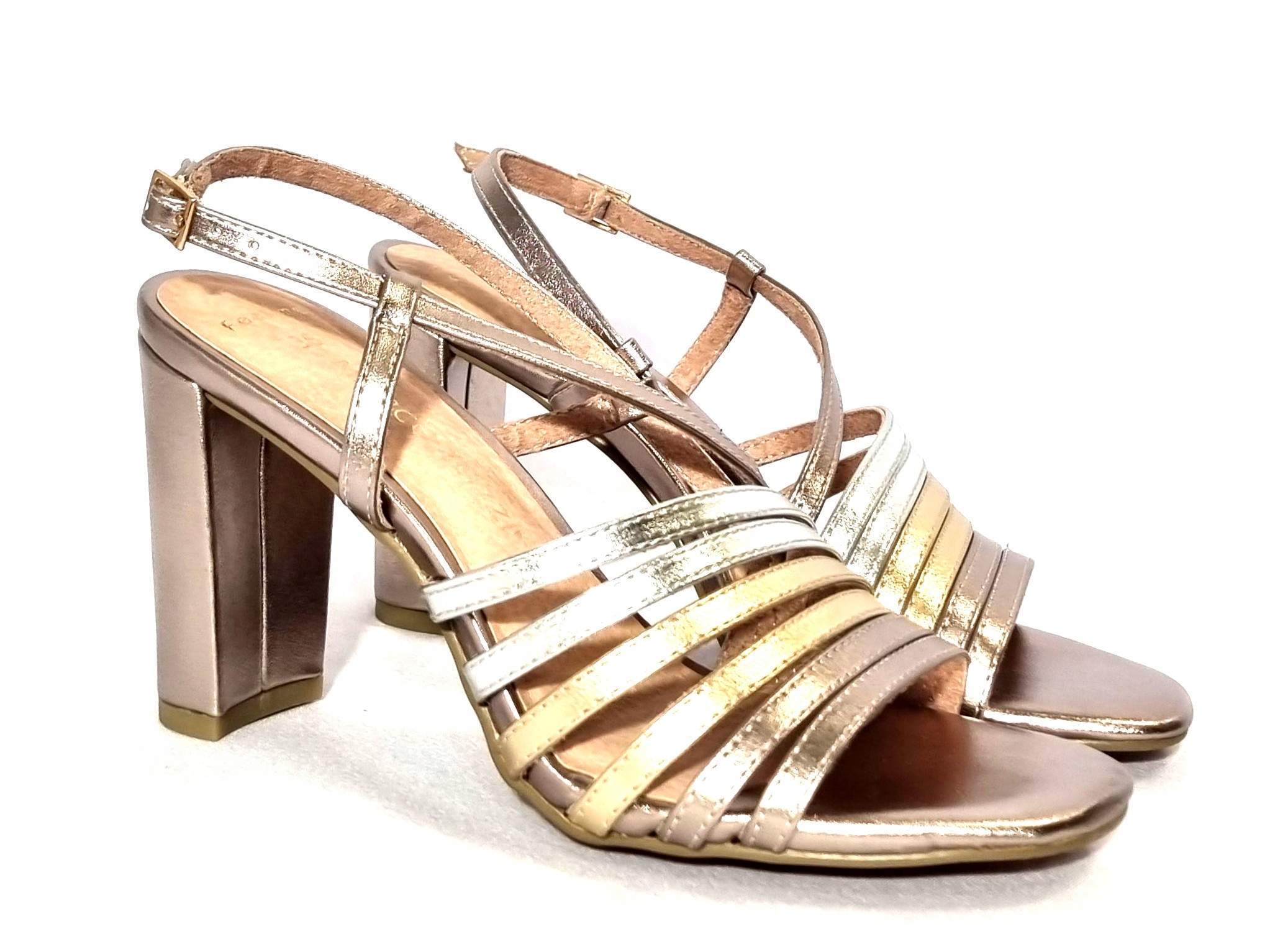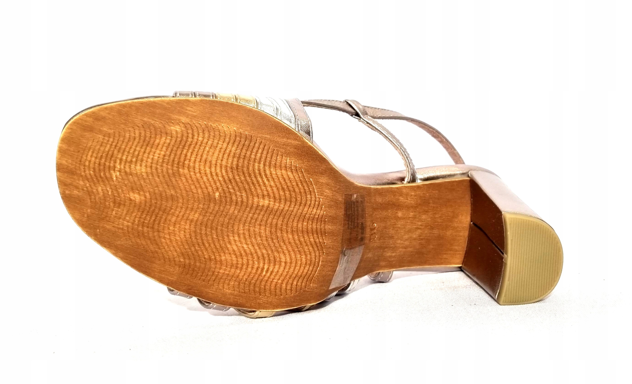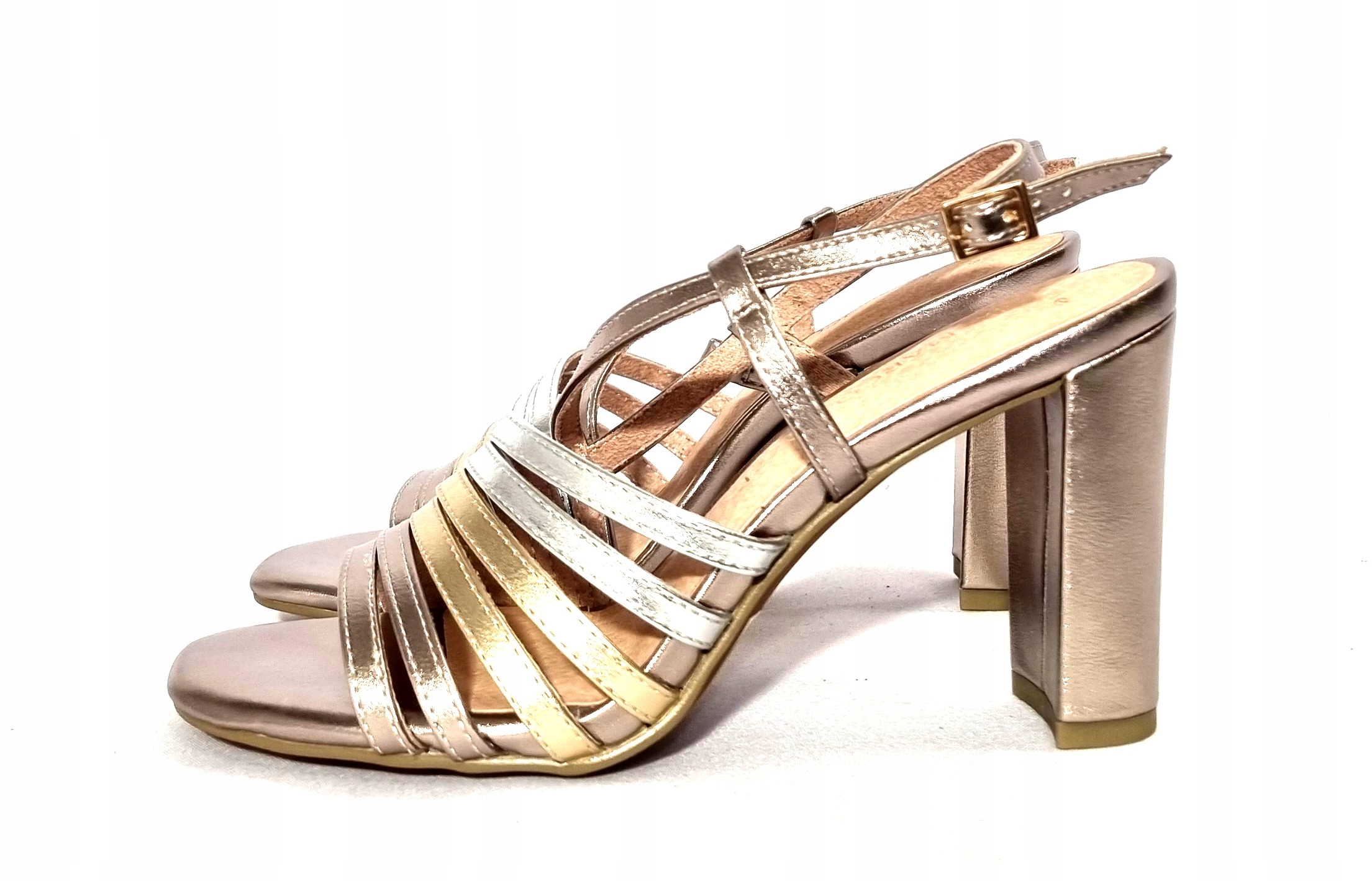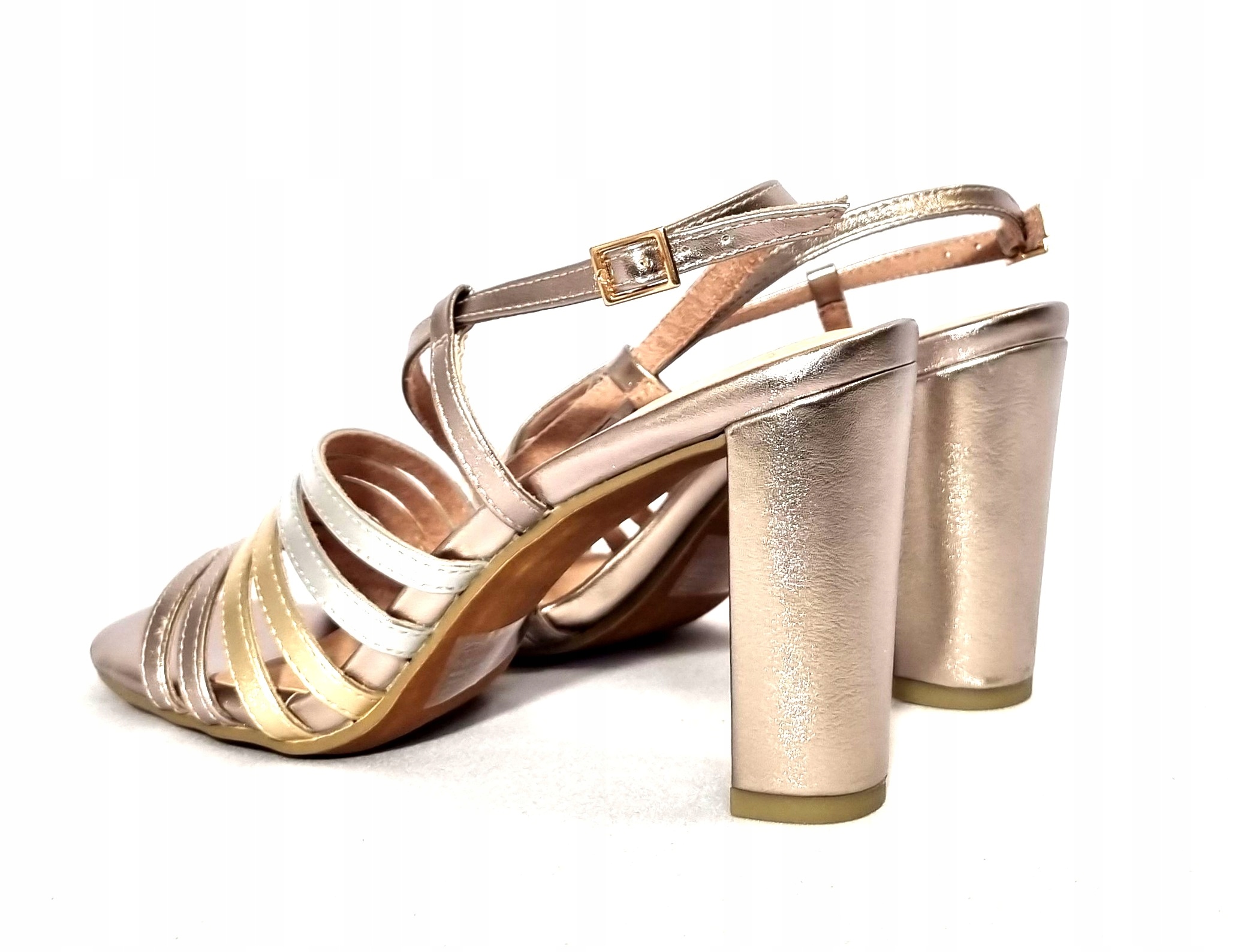 Przedstawiamy panstwu sandały damskie na wysokim obcasie marki Marco Tozzi. Wykonane zostały z błyszczącej skóry ekologicznej. Słupek o wysokości 9,6 cm. Zapięcie na sprzączkę.