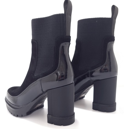 Wykonane z wysokiej jakości skóry naturalnej, gwarantują trwałość i długotrwałą satysfakcję z ich użytkowania. Cholewka wykonana z połączenia  skóry lakierowanej oraz zamszowej. Górna część cholewki obszyta elastyczną tkaniną, nie tylko ułatwia zakładanie obuwia, ale także zapewnia dopasowanie do Tojej stopy.  Wnętrze wyłożone miękkim polarem, zapewniając Ci niezrównany komfort przez cały dzień. Podeszwa traperowa zapewnia stabilność i dobrą przyczepność do różnego rodzaju podłoża. Stabilny, szeroki obcas w formie słupka sprawia, że możesz nosić je przez dłuższy czas, nie obawiając się bólu czy zmęczenia nóg.