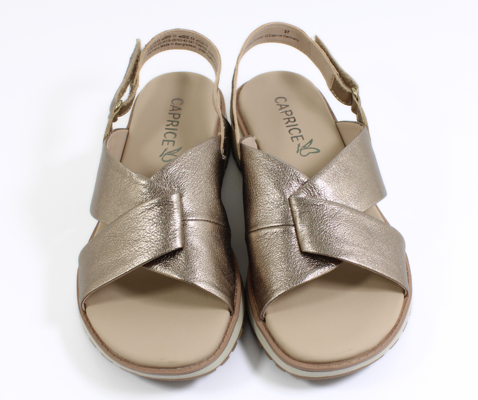 Szukasz idealnych sandałów na lato? Postaw na niezrównany komfort i wyjątkowy styl z sandałami Caprice! Wykonane z miękkiej skóry naturalnej w pięknym złotym kolorze, zachwycają elegancją i trwałością. Złoty kolor sandałów doda charakteru każdej letniej stylizacji, podkreślając Twój styl i dodając nutkę elegancji. Wkładka pokryta skórą naturalną została wykonana z pianki z technologią Memotion, która perfekcyjnie dopasowuje się do kształtu stopy i amortyzuje wstrząsy podczas chodzenia. Sandały posiadają zapinanie na rzep, zapewniające idealne dopasowanie do stopy. Lekka podeszwa o wysokości 1 cm z niewysokim 3-centymetrowym obcasem w kształcie koturnu zapewnia stabilność i wygodę podczas letnich spacerów.