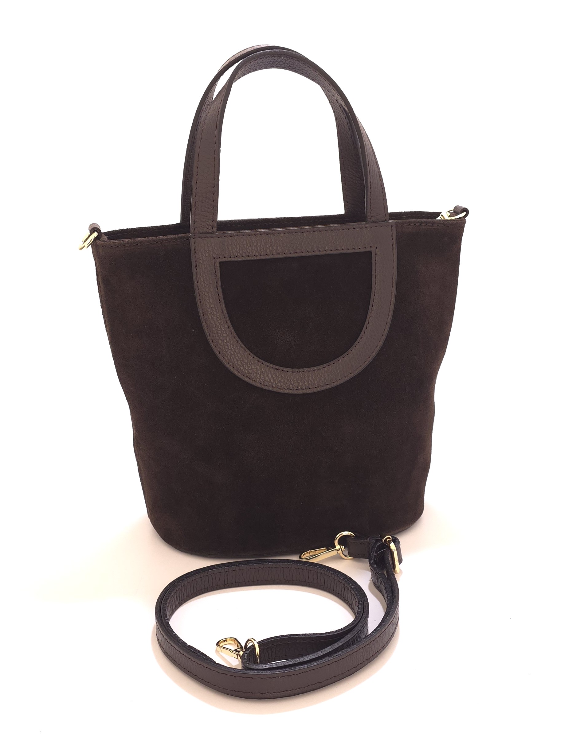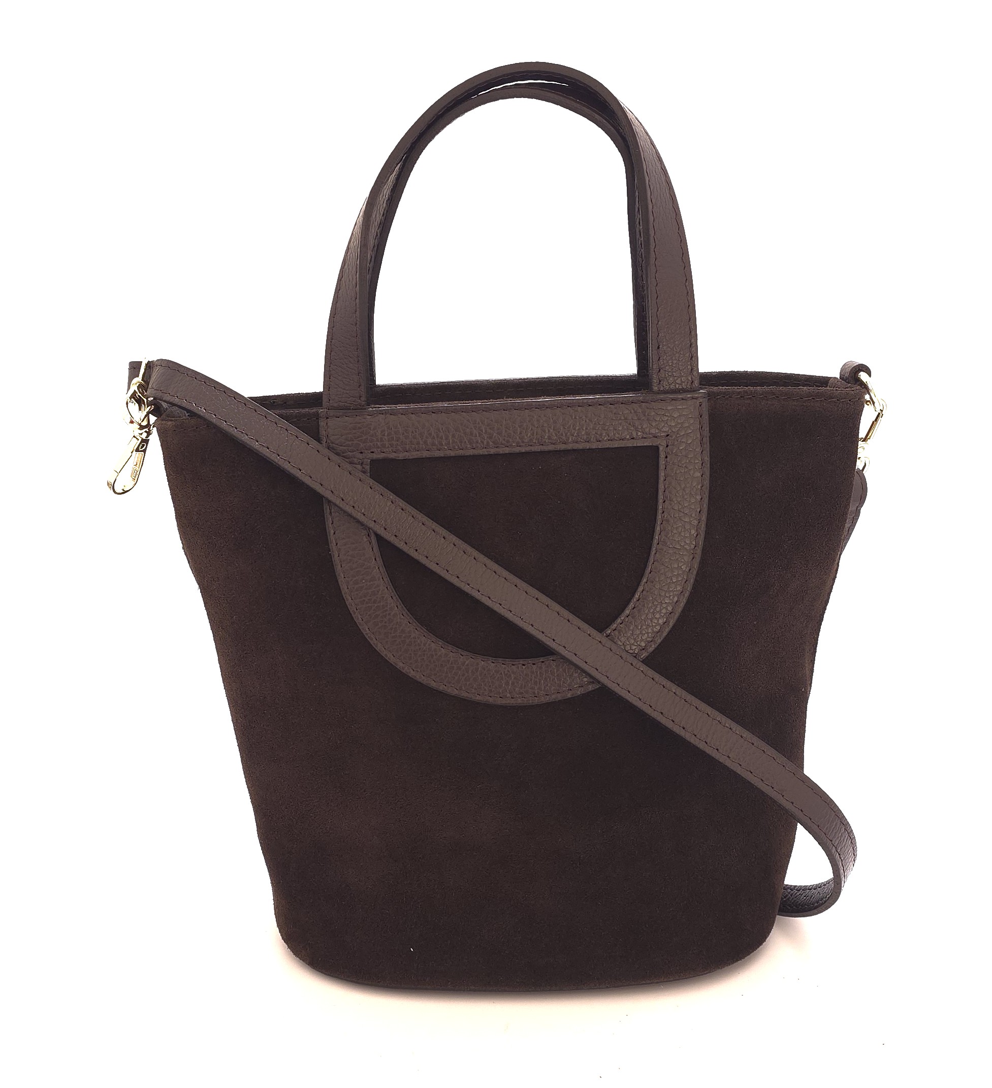 - Elegancki kuferek damski z odpinanym paskiem, wykonany ze skóry zamszowej w czekoladowym kolorze.