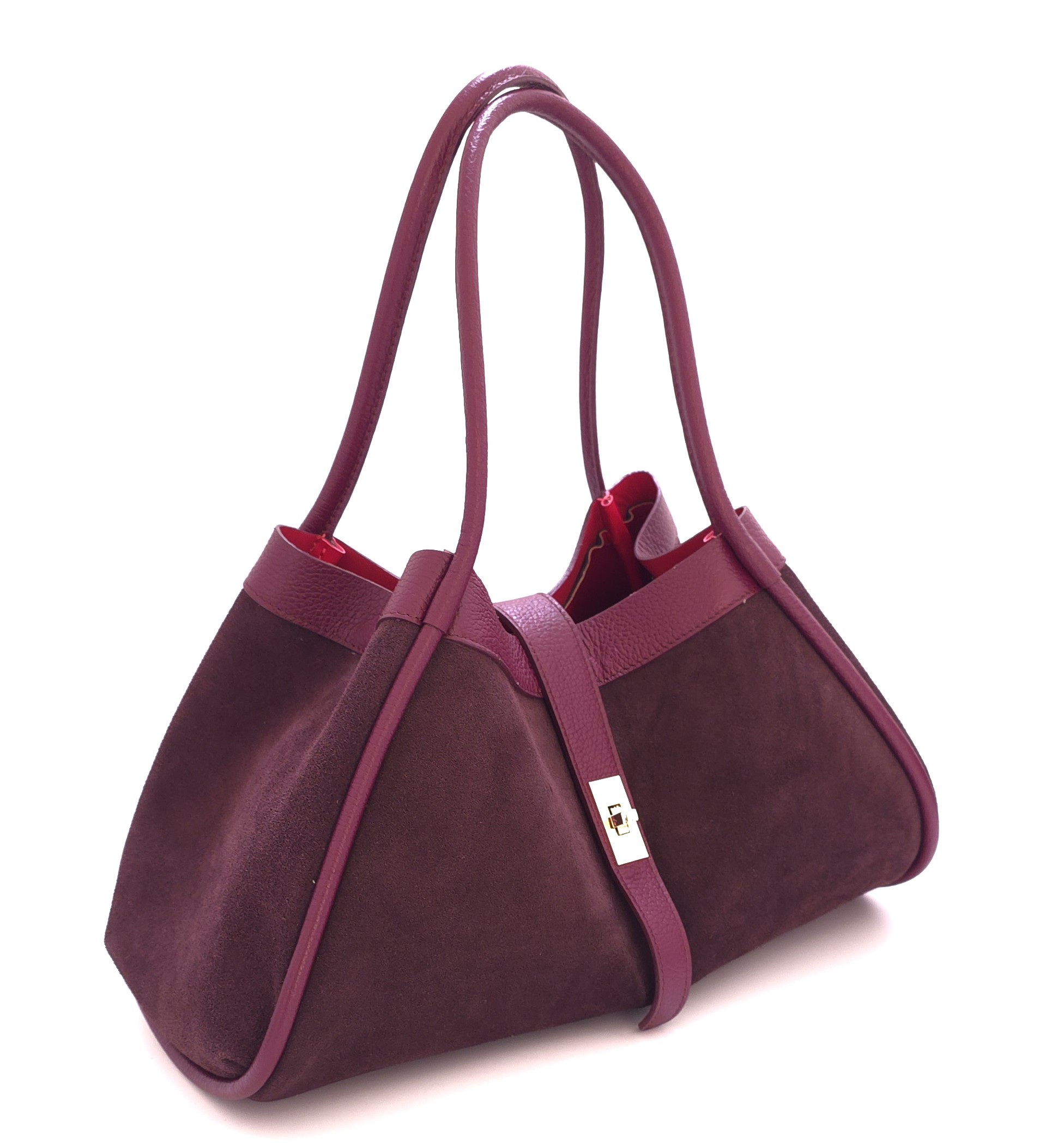 - Skórzana torebka damska do ręki w kolorze bordowym wykonana z naturalnej skóry zamszowej.