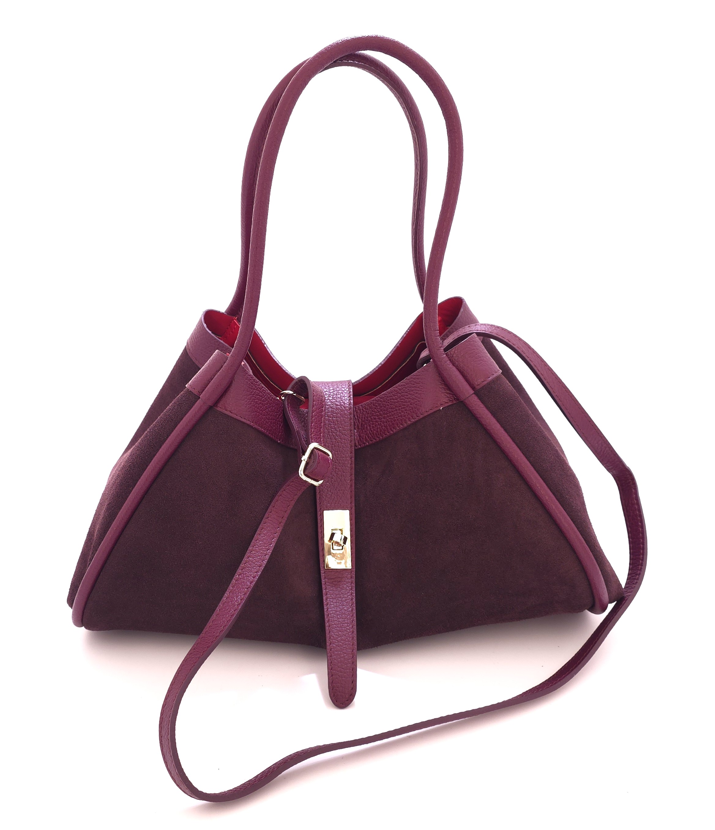 - Torebka uszyta z naturalnej skóry zamszowej w bordowym kolorze,