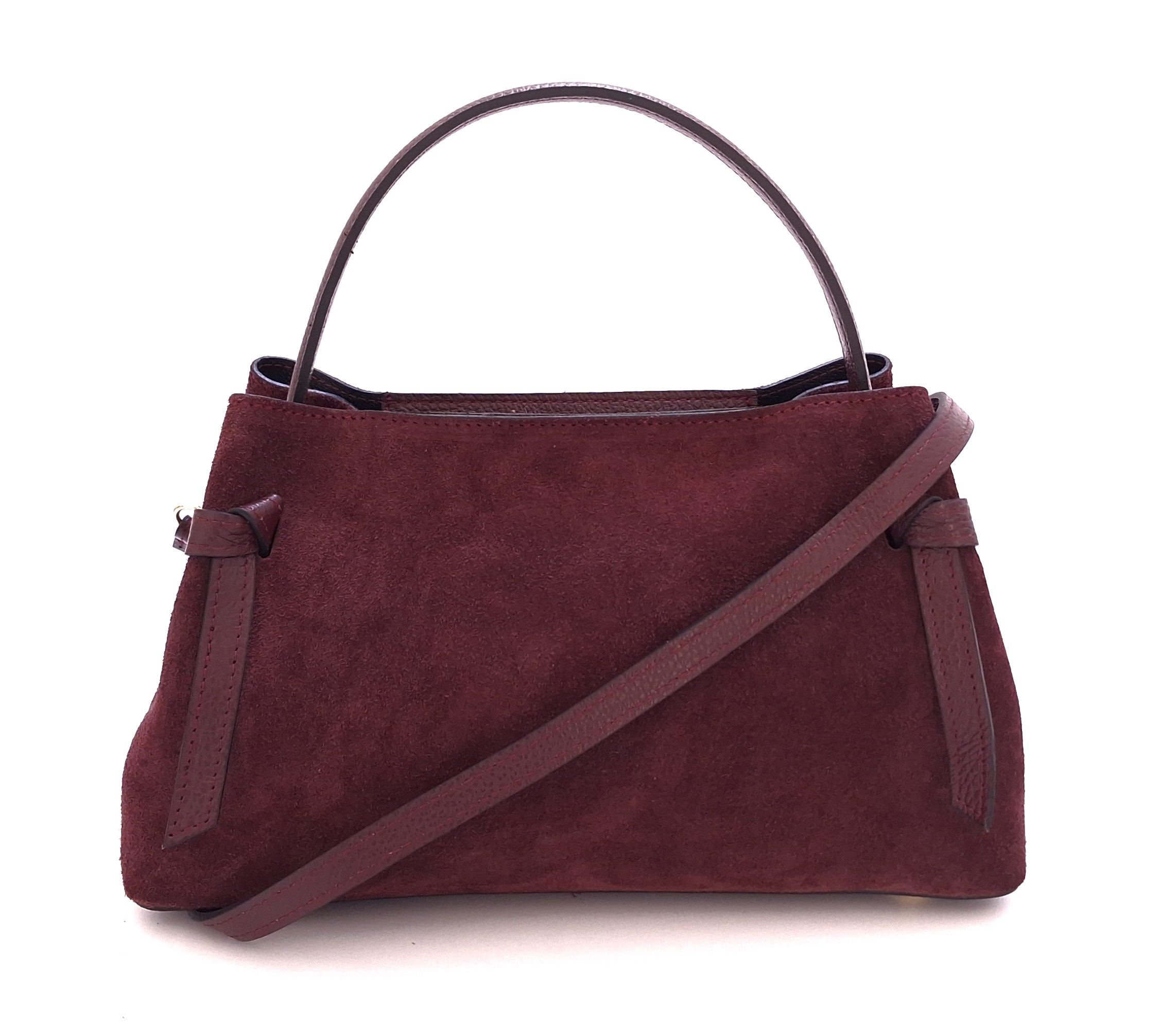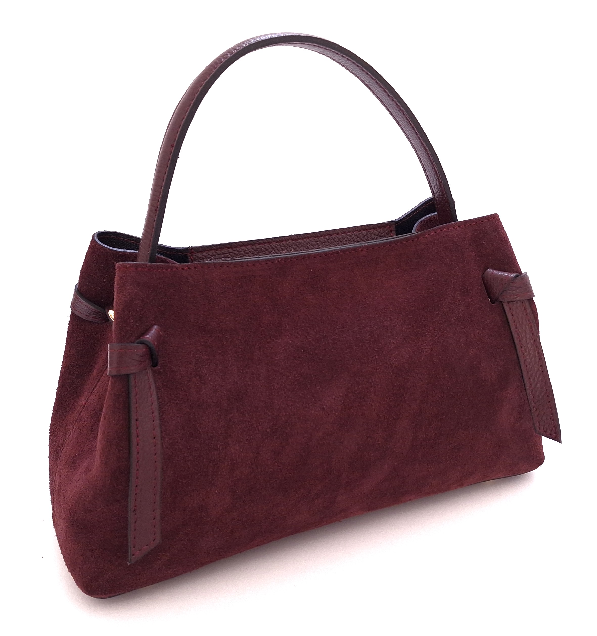 - Torebka uszyta z naturalnej skóry zamszowej w bordowym kolorze,
