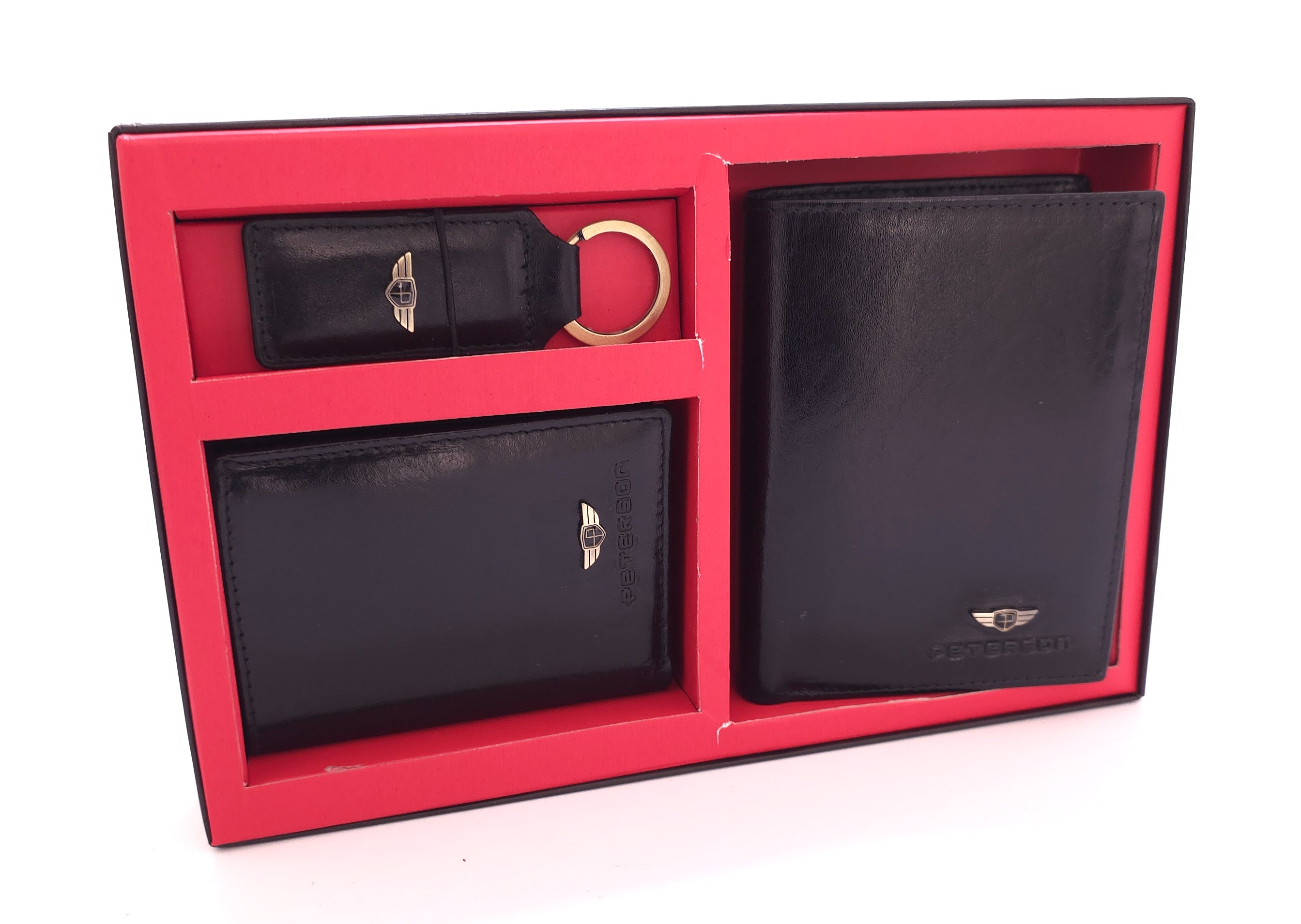 Trzyczęściowy zestaw prezentowy w pudełku składający się z portfela, etui na karty płatnicze i breloka do kluczy wykonanych z naturalnej skóry w czarnym kolorze.