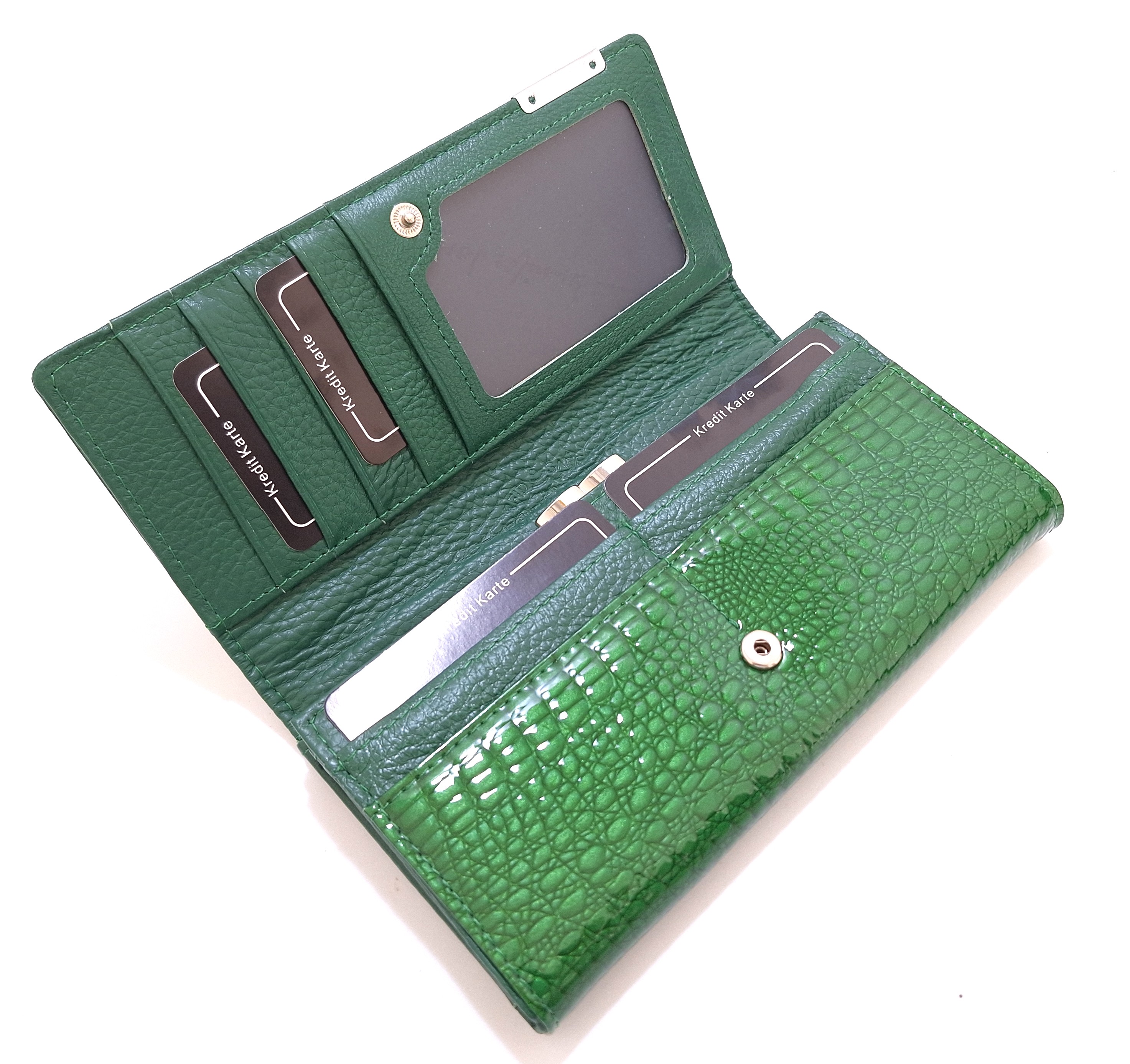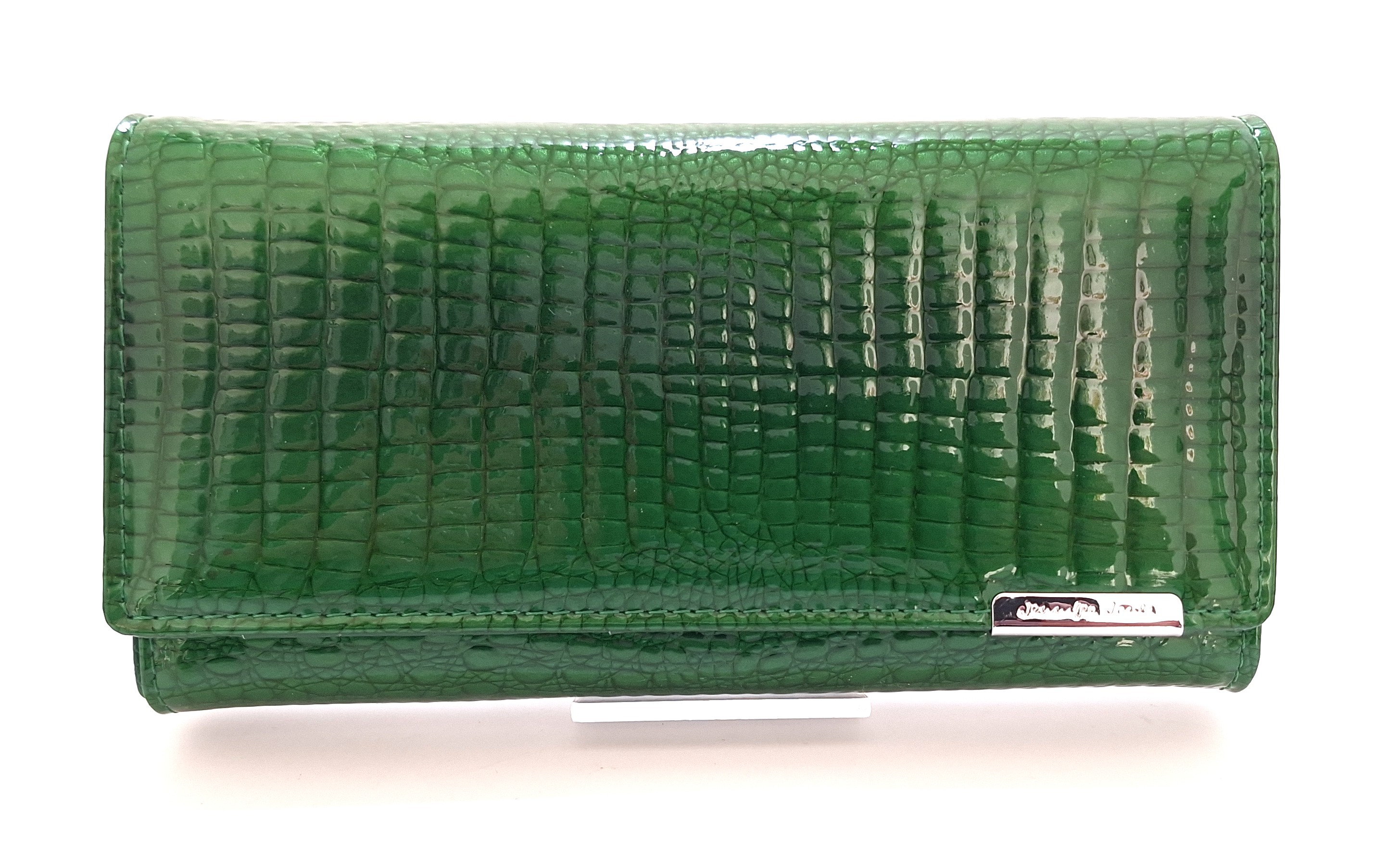 - Damski skórzany portfel w zielonym kolorze o lakierowanym wykończeniu. Wyposażony w wiele przegródek. Pomieści dowód rejestracyjny. Posiada ochronę RFID.