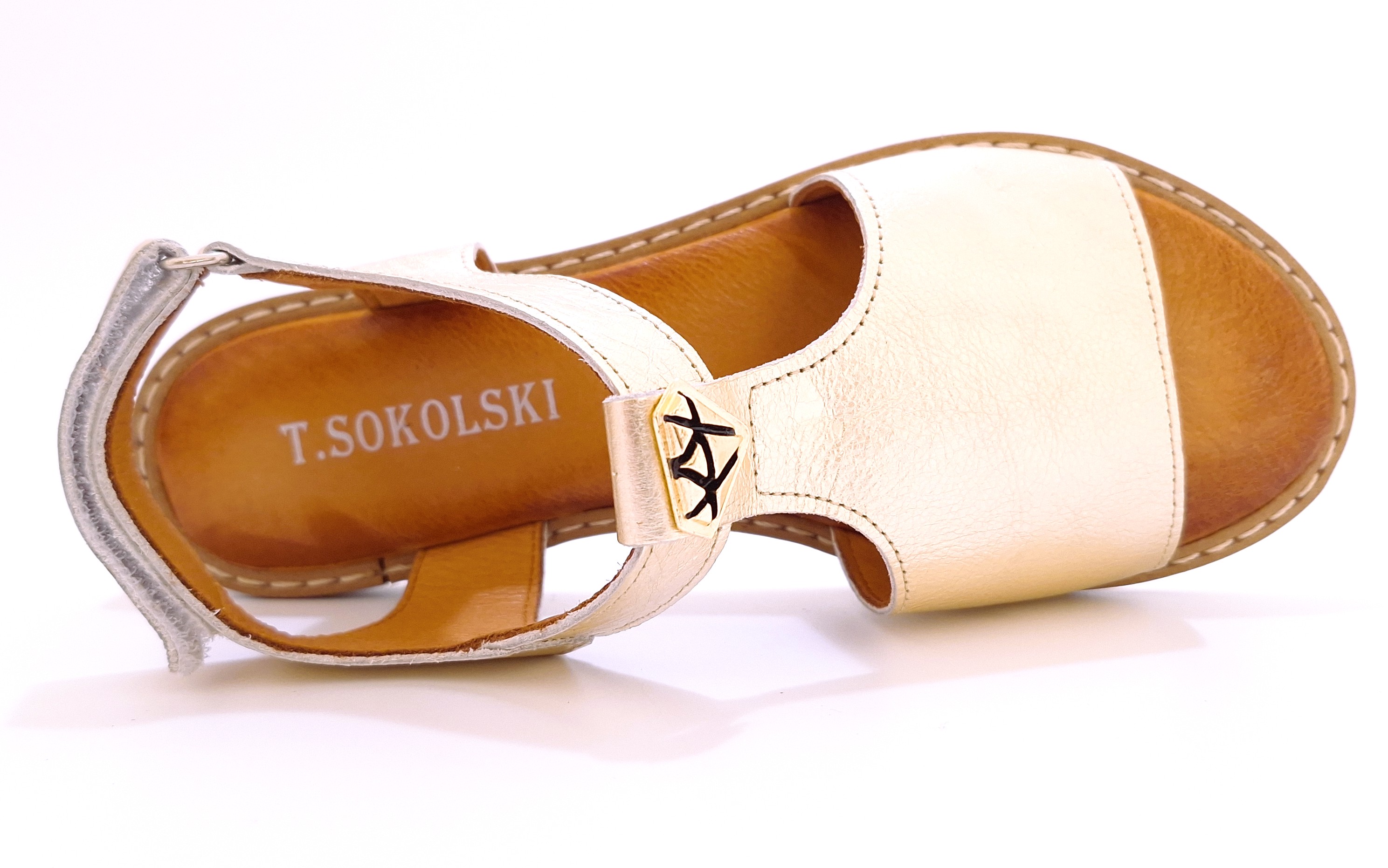 Złote sandały damskie z licowej skóry marki T.Sokolski to doskonały wybór na ciepłe, letnie dni. Metaliczny złoty kolor dodaje im szyku i sprawia, że każda stylizacja nabiera modowego charakteru. Doskonale sprawdzą się zarówno na co dzień, jak i na specjalne okazje. Osadzone na płaskim, szerokim obcasie, zapewniają komfort i stabilność podczas chodzenia. Regulowany pasek na rzep umożliwia idealne dopasowanie do stopy i szybkie zakładanie.