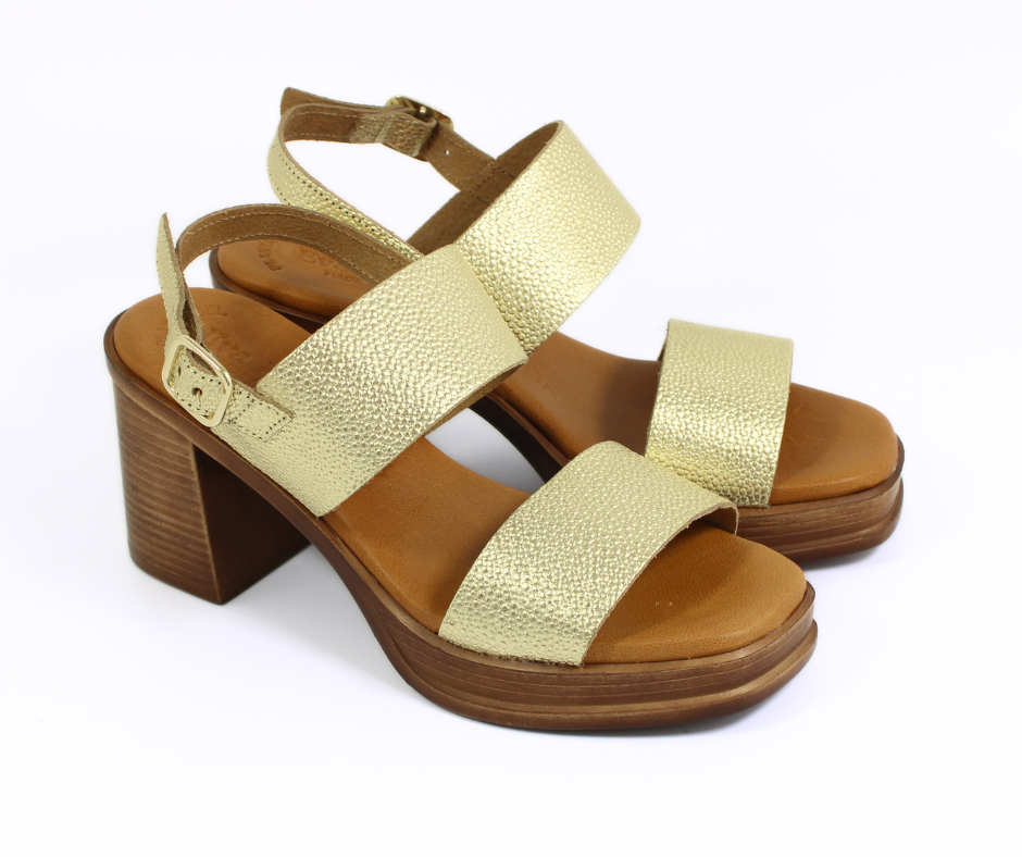 Szukasz idealnych sandałów na lato? Postaw na klasykę w nowoczesnym wydaniu! Sandały Eva Frutos to połączenie elegancji, wygody i najwyższej jakości wykonania. Sandały wykonane ze skóry naturalnej w kolorze złotym. Złota barwa perfekcyjnie wpisuje się w wakacyjne trendy, nadając stylizacji elegancji i szyku. Szerokie paski delikatnie oplatają stopę, zapewniając stabilne wsparcie bez otarć i podrażnień. Wkładka żelowa wykończona skórą naturalną gwarantuje miękkość i wygodę podczas całodziennego użytkowania. Regulowane zapięcie pozwala na idealne dopasowanie do stopy, zapewniając stabilność i bezpieczeństwo. Model osadzony na szerokim obcasie o wysokości 8 cm i platformie o wysokości 2 cm, które wysmuklają sylwetkę i dodają pewności siebie.