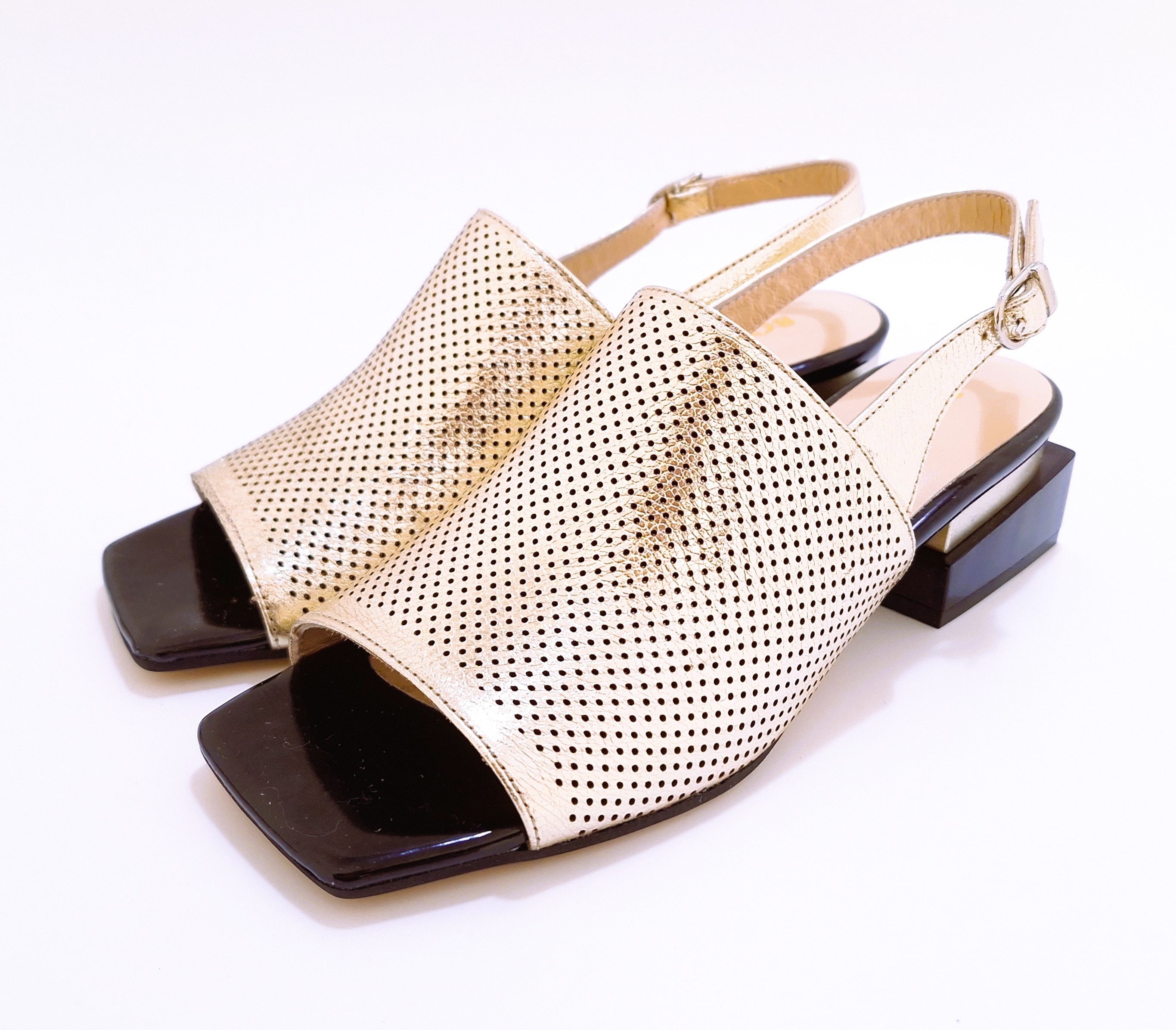 Złote sandały damskie na szerokim, niskim obcasie marki Boccato wykonane z wysokiej jakości naturalnej skóry to elegancki model, idealny na specjalne okazje. Delikatne perforacje na cholewce dodają lekkości i nowoczesnego charakteru. Zapięcie na klamerkę na pięcie umożliwia idealne dopasowanie do stopy. Szeroki obcas zapewnia komfort noszenia i stabilność przez cały dzień.